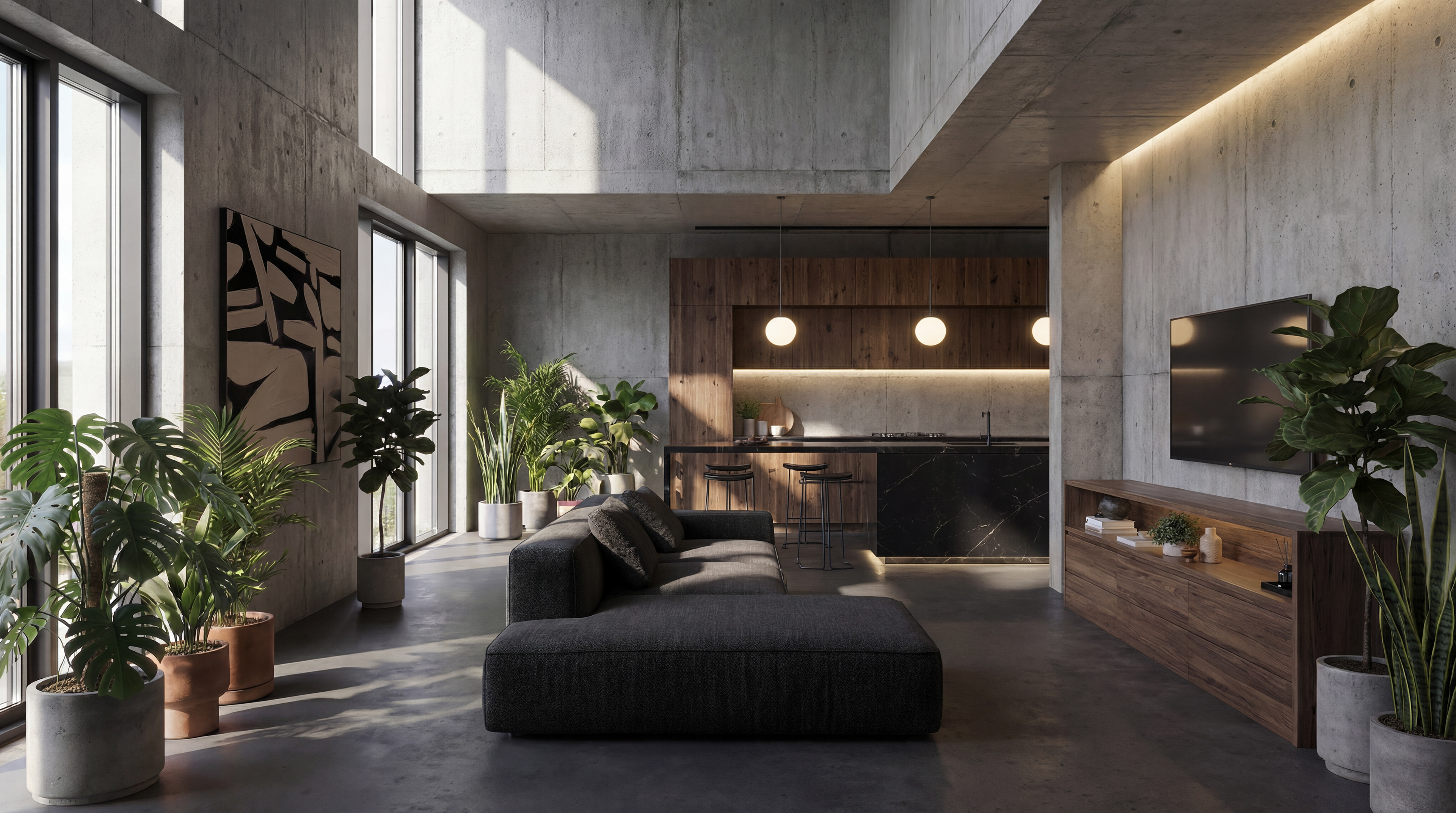 Warm minimalism, pure forms, and natural light In this project, the combination of exposed concrete, wood, and greenery creates the perfect balance between brutalism and coziness. The clean geometry, neutral palette, and furniture design make the space functional, sophisticated, and inviting — exactly how we believe architecture should be: essential, human, and inspiring. A project designed to highlight light, celebrate materials, and invite you to live every detail.